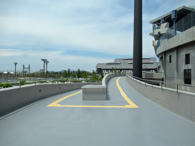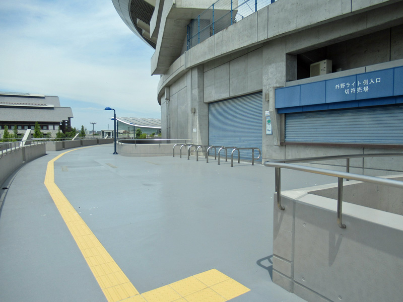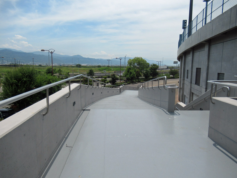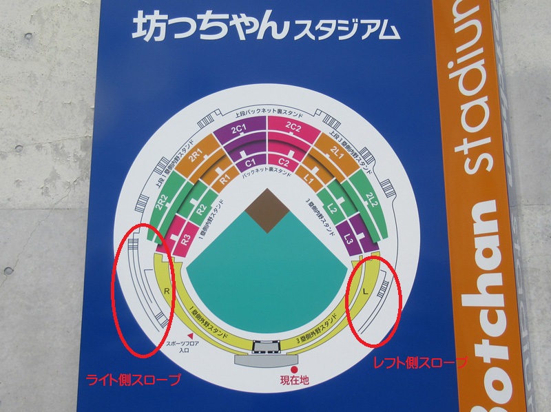 坊っちゃんスタジアムは、バリアフリー社会への対応として、他の国内球場では例の少ない、車椅子席の積極的な確保(内外野136席)を実現しています。また、内野から外野まで、同じレベルで1周できるようになっています。 (松山市文化・スポーツ振興財団HPより)