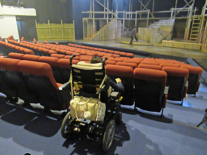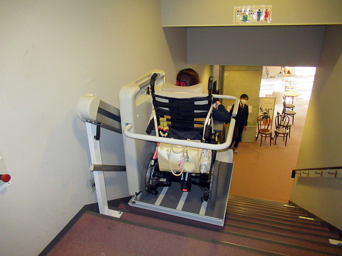 車椅子の方がロビーから座席まで行くには昇降機を利用するようになります。スタッフの方が誘導してくれます。昇降機の乗降りに約2分かかります。 (ミュージカルは定刻に始まりますので、車いすの方は時間に余裕を持たせて行かれることをお勧めします。)