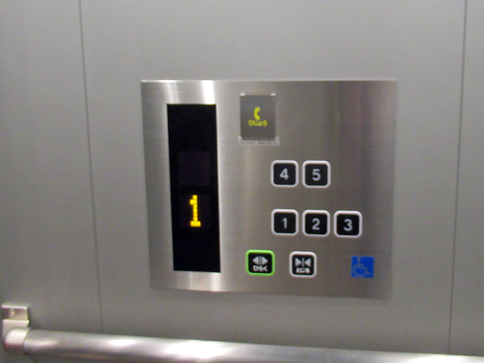 エレベーターが2基設置されていますが、向かって左側のエレベーターが車椅子対応となっています。鏡、操作ボタン(両側面)あり。ボタンも浮き彫りです。