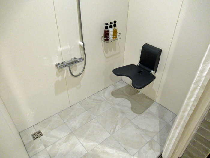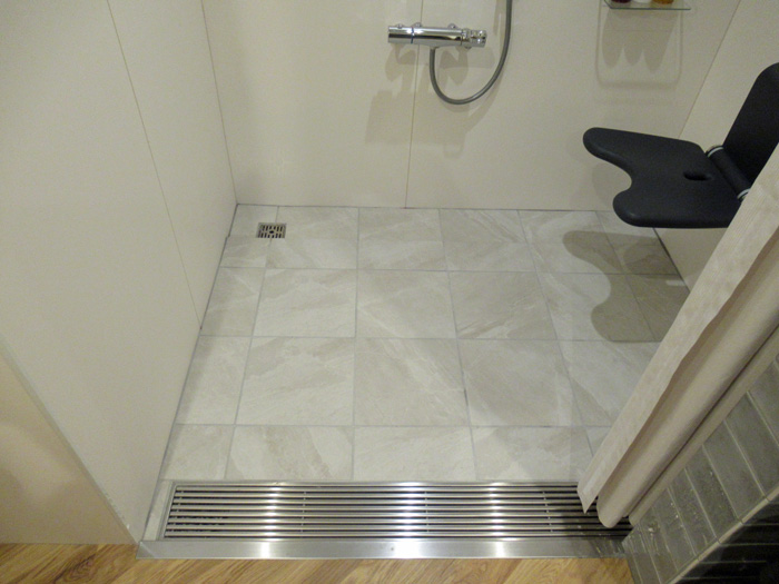 | バスルームドア…引き戸(80㎝) 手すり…両サイドにあり(L字固定、U字型上下可動、背もたれあり シャワーウーム…段差なし(スロープ状) |