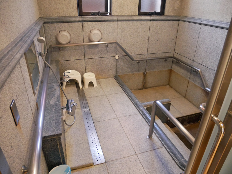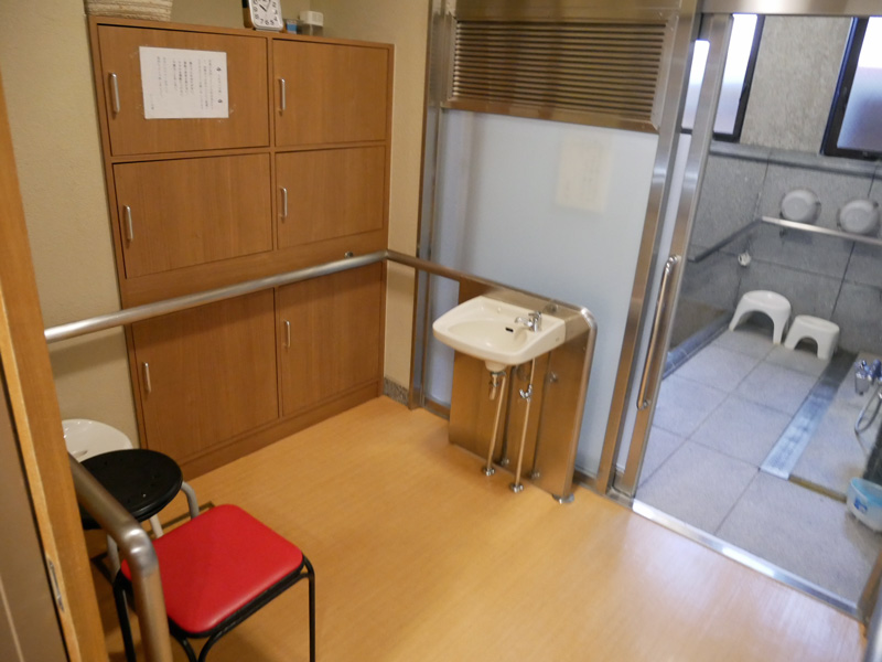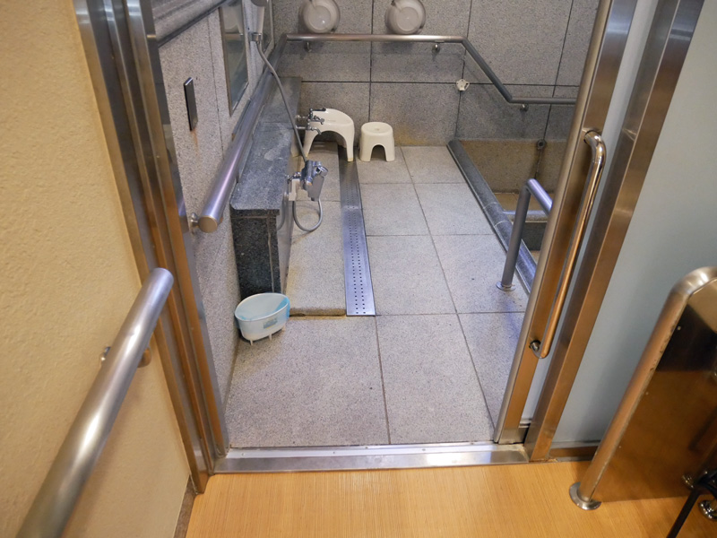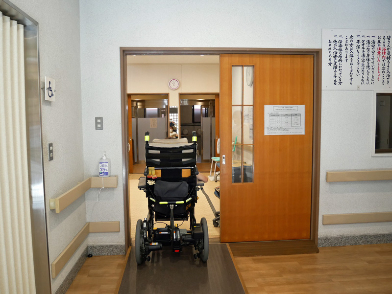 休憩室から脱衣場、脱衣場から浴室へ段差2㎝程度ありますが、スロープ状になっています。浴室扉幅90㎝。浴室てすり…あり。
