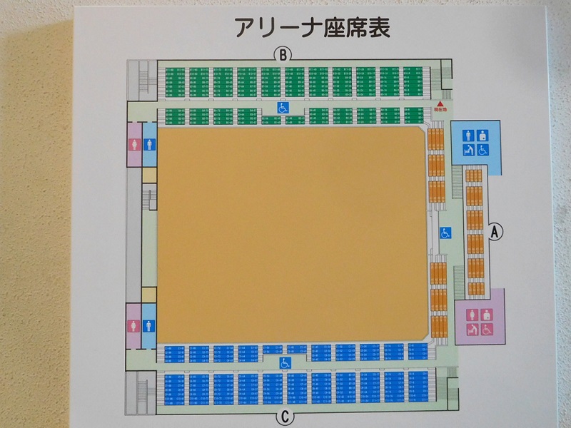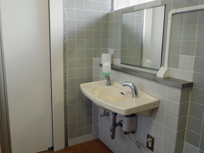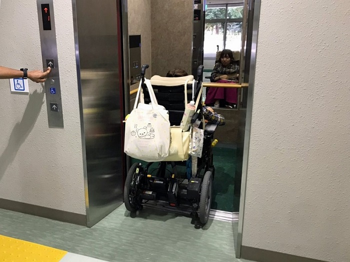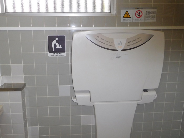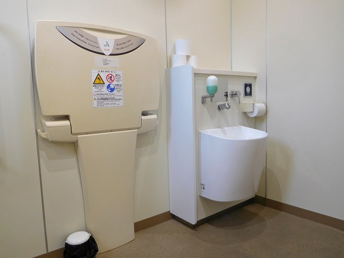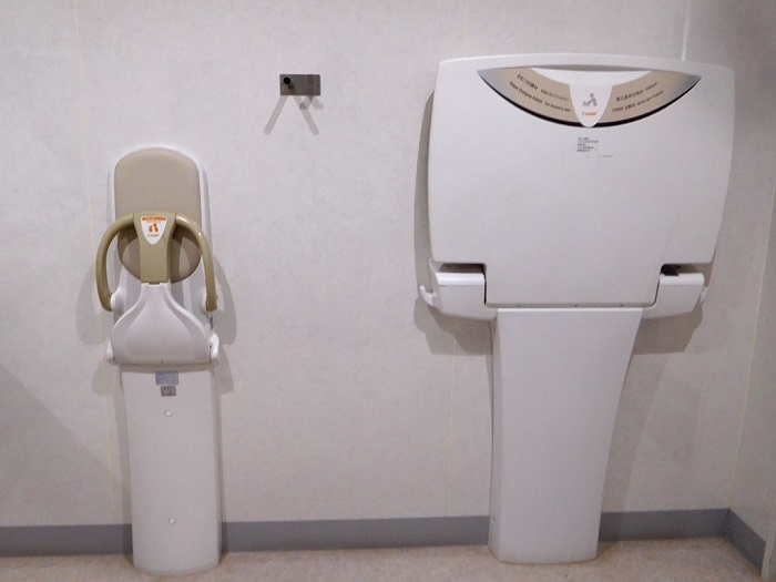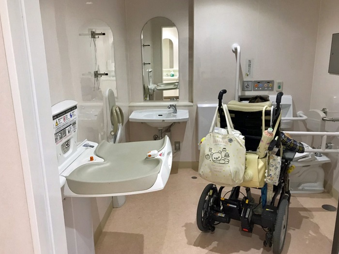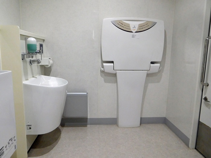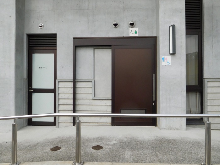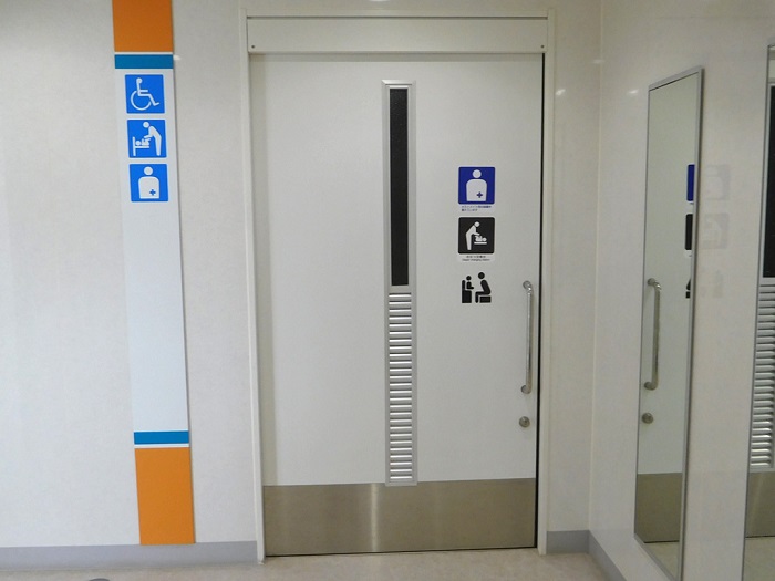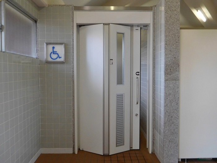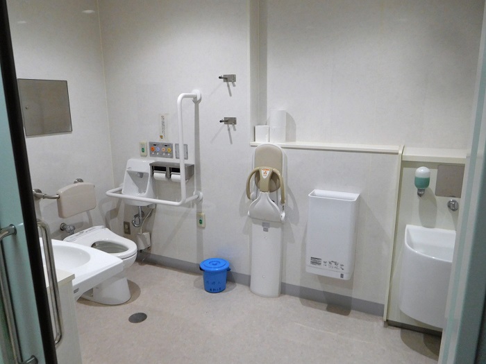 男女トイレ横にバリアフリートイレがもうけられています。写真は車椅子が入っているのは女子側、それ以外は男子側です。