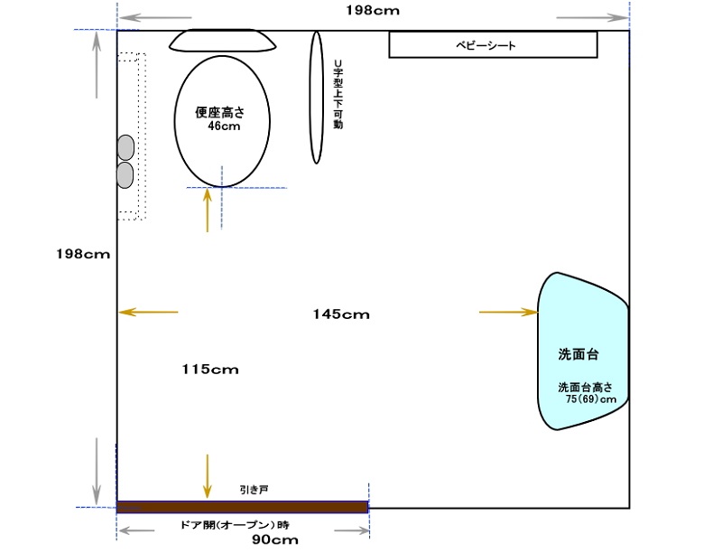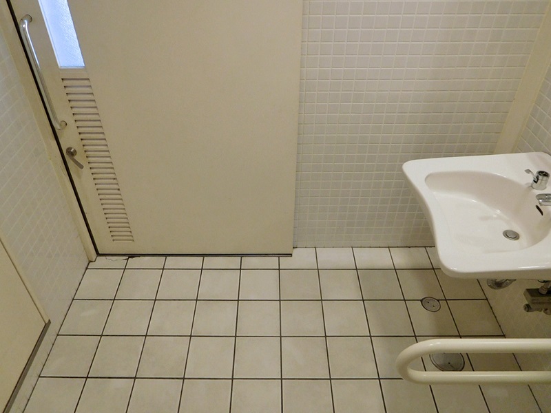 男子トイレ、女子トイレそれぞれにバリアフリートイレが設置されています。写真、平面図は男子トイレ側のものです。
