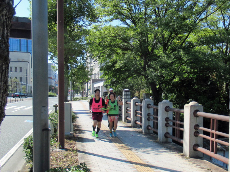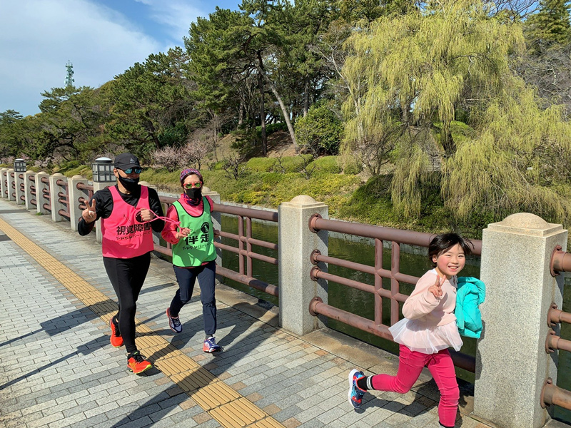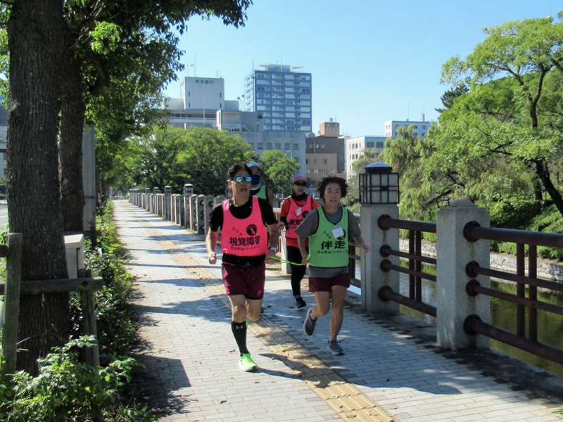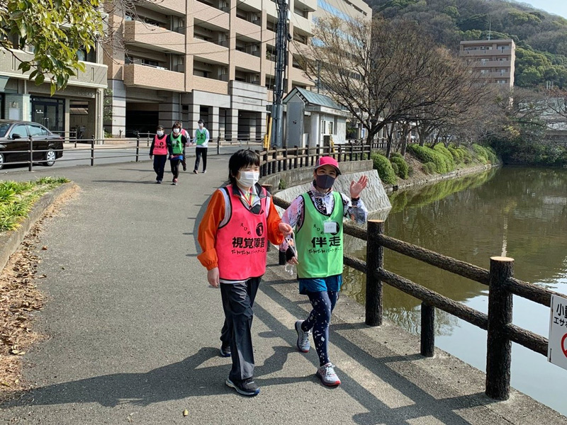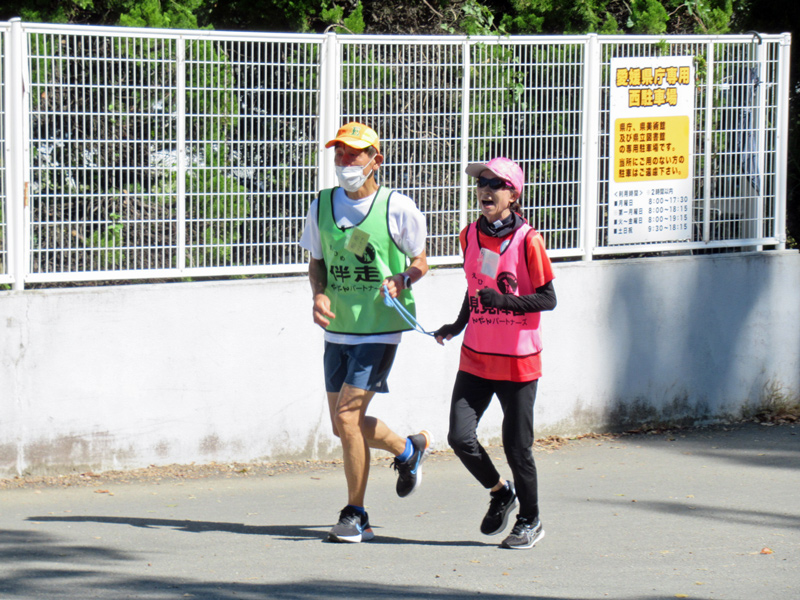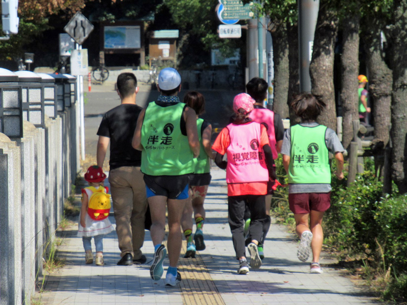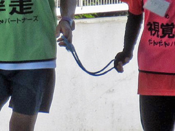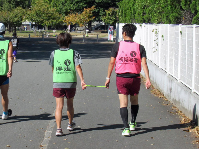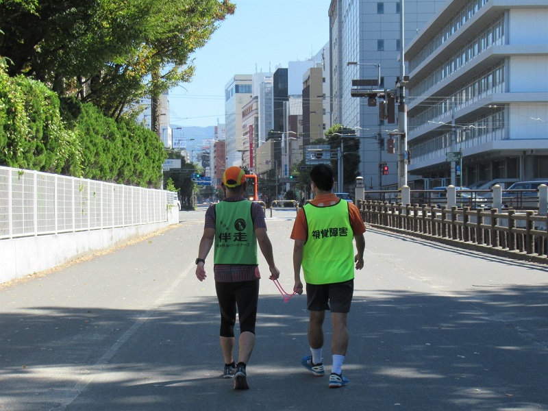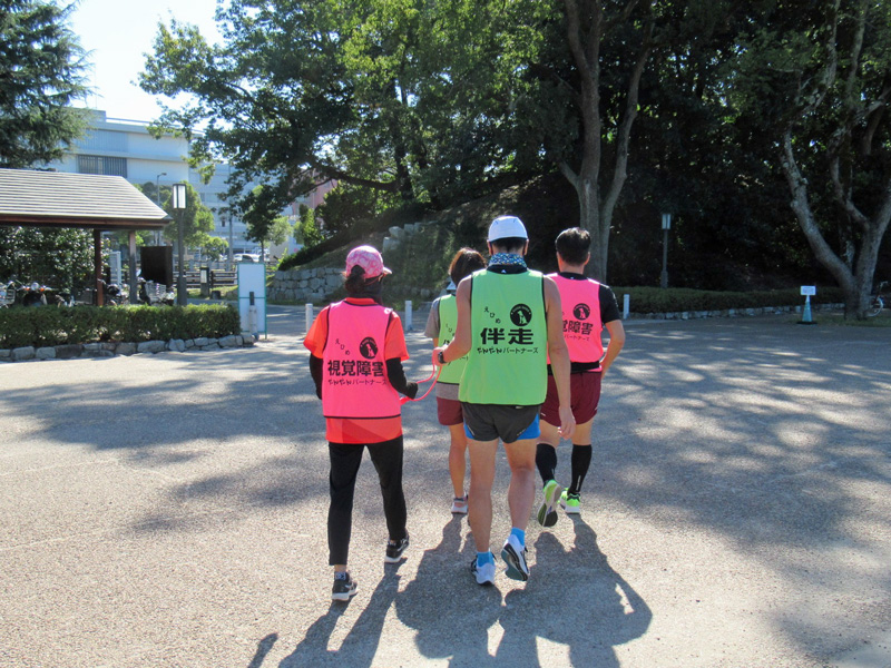 また練習時の伴走は2人で走るのではなく、前後に人が付き、前の人は通行人に(よけてくれるよう)声掛けをしたりします。幅2人分必要で、それなりのスピードで走るので安全確保のためにそのようにしています。
