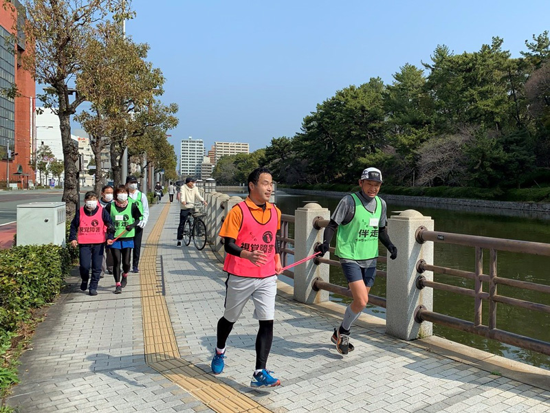 最初は弱視の方の伴走をしてもらい、伴走の仕方、走るときの喋り方、(人の)よけ方などを教えます。その人からOKがでたら全盲の方の伴走をするようにしています。