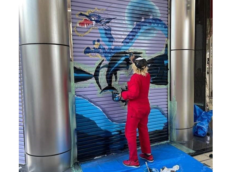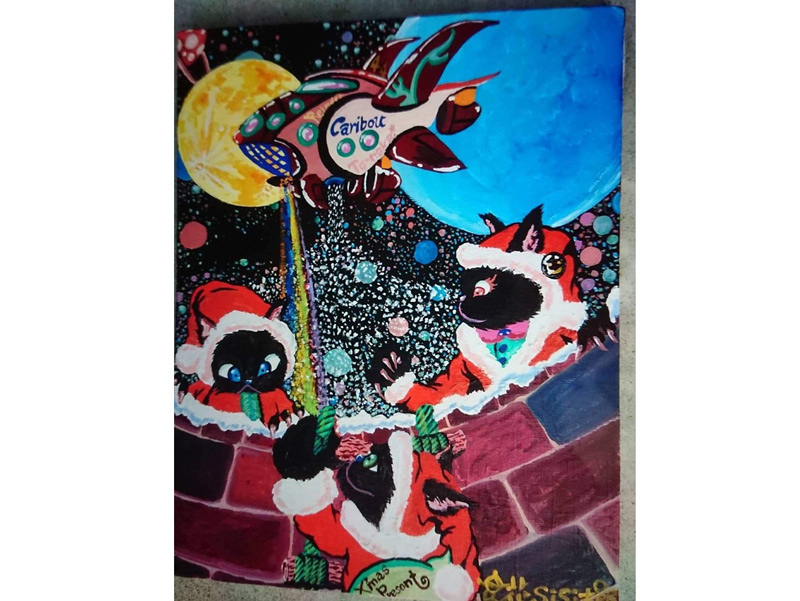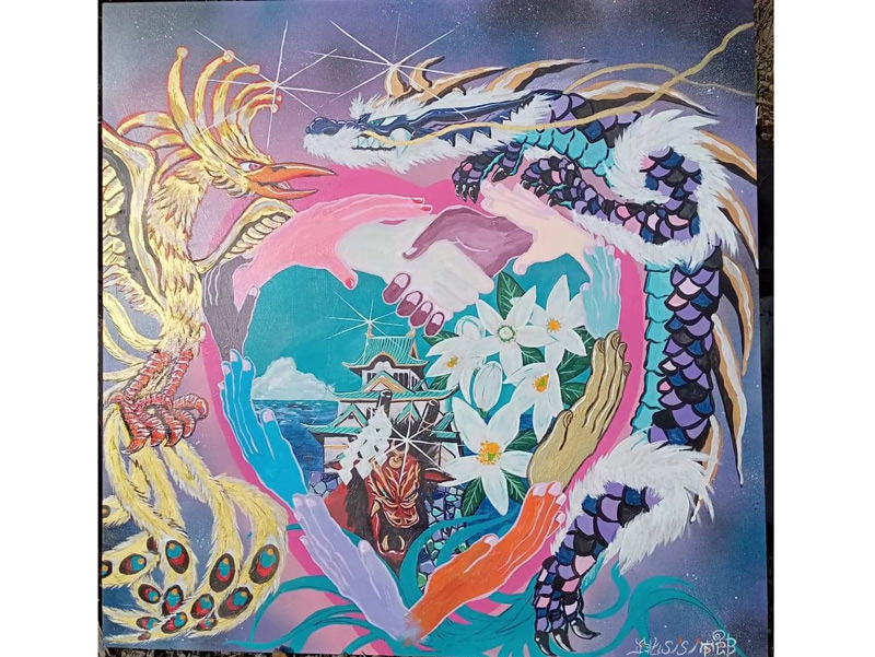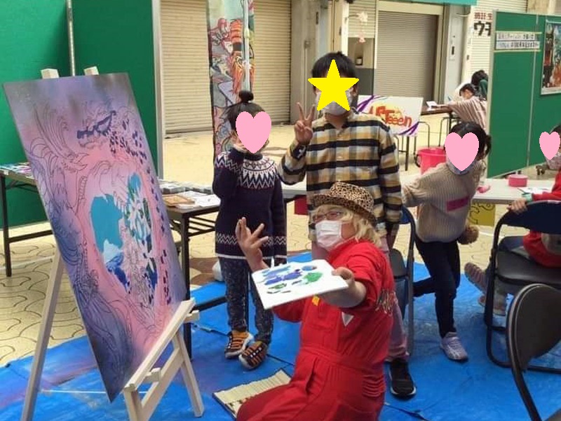 この迫力ありロマンあふれる絵を描いたのは現在愛南町を拠点に活動している立花SISI太郎さん。35歳の時に生死をさ迷うほどの大事故に遭うも奇跡的に復活。リハビリとして始めたちぎり絵をきっかけに(子供時代に好きだった)絵を復活。現在高次脳機能障害という後遺症を抱えながらも、絵描きとして、ミュージシャンとして活躍しつつ、新たな夢に向かってまい進中!!
