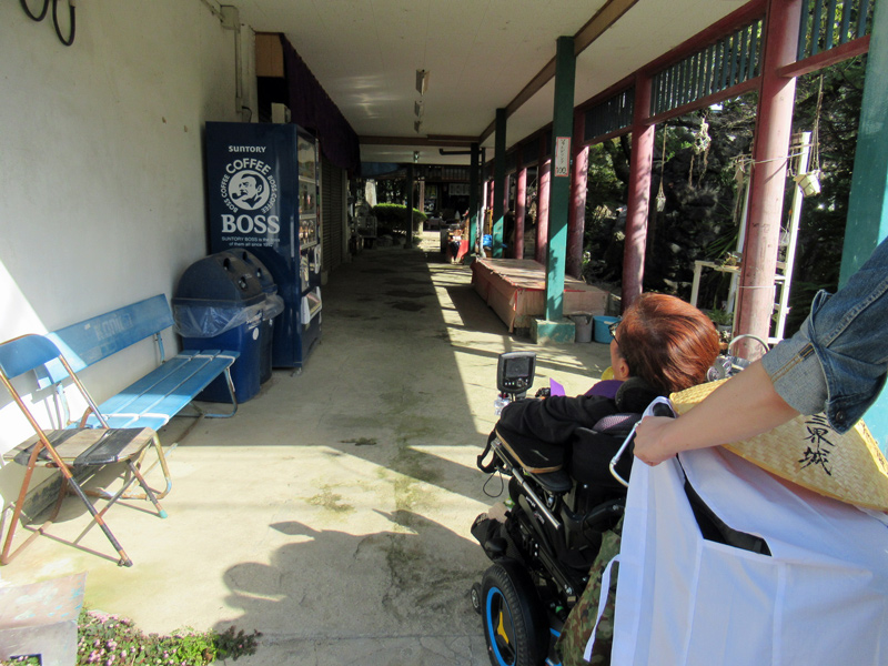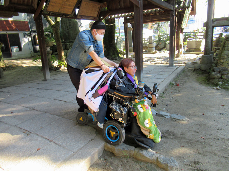 しかしながら石の参道はガタガタで、車いすを操作する指が何度も落ちてしまい、その都度ヘルパーさんに直してもらって奥へと進みました。昔からある参道なので仕方ないかな…。