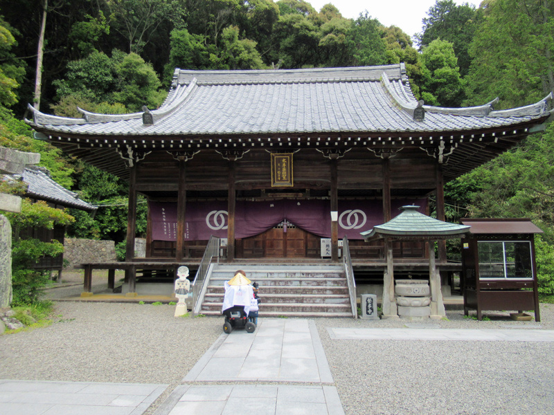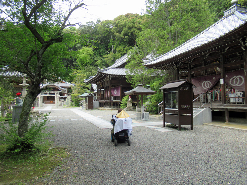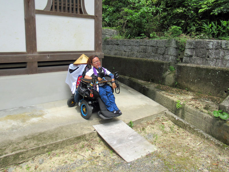 参考までに中庭から納経所前の舗装された道を通って本堂に行こうとすると、一見階段しかないように見えますが、右端にスロープがあります。ただし砂利道を横切るようになります。また最後の坂(スロープ)は傾斜がとてもきつく、ヘルパーさんに手伝ってもらってなんとか登ることができました。もし一人で行かれるならばどなたか(参拝者)に声をかけて押してもらうのがいいと思います。
