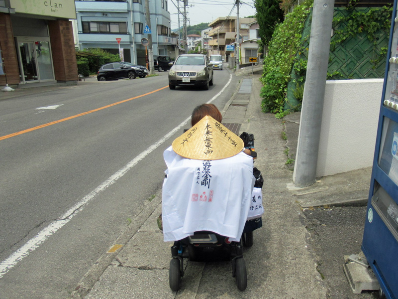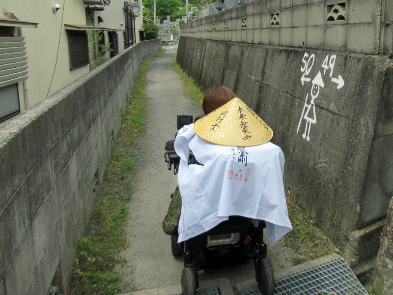 車の通りの多い道路からわき道にそれ、へんろ道を歩いて行くとところどころにかわいい案内板があり、それを目印に歩いていくと迷うことなく進むことができました。しかしへんろ道は農道であることも多く、そのため道は細くアップダウンがあったり、ガタガタ道もあったりしました。僕の(電動)車いすでは行けましたが、手押しの車いすの方は少ししんどいかもしれません。それでも自然を体で感じたい方は歩き遍路をお勧めします。途中へんろ道を行くか舗装された道路を行くか迷っていると、へんろ道沿いに住む方が以前車いすで通った人がいるよと教えてくれました。