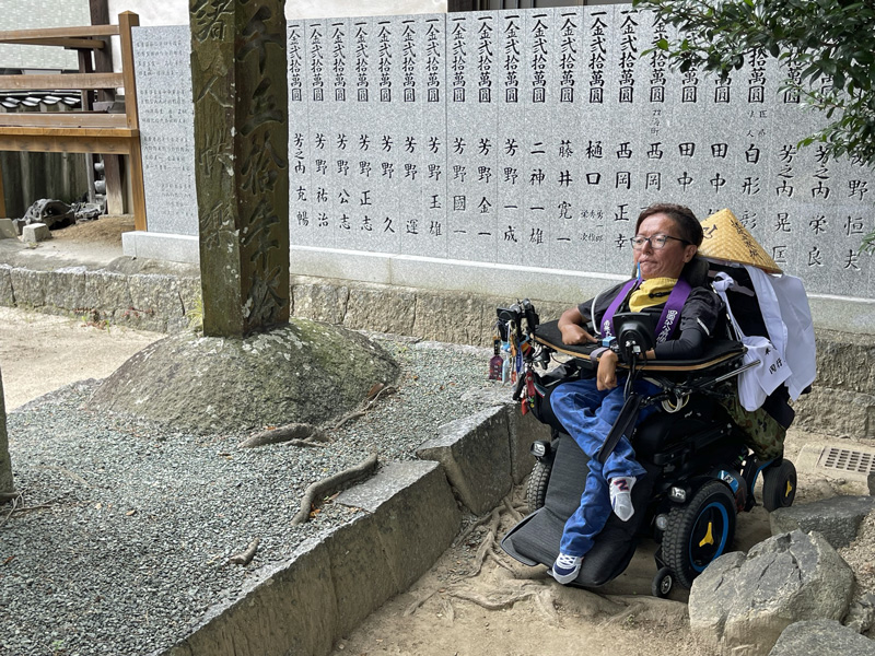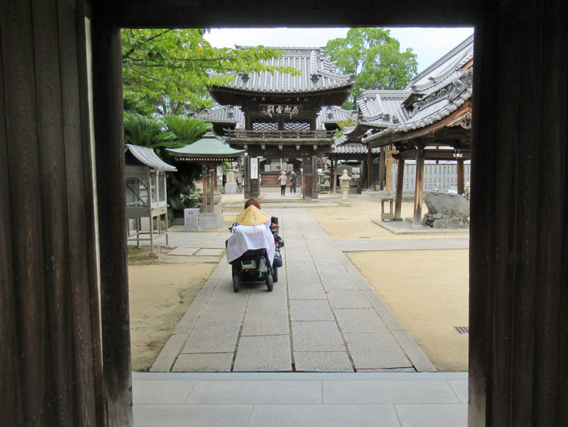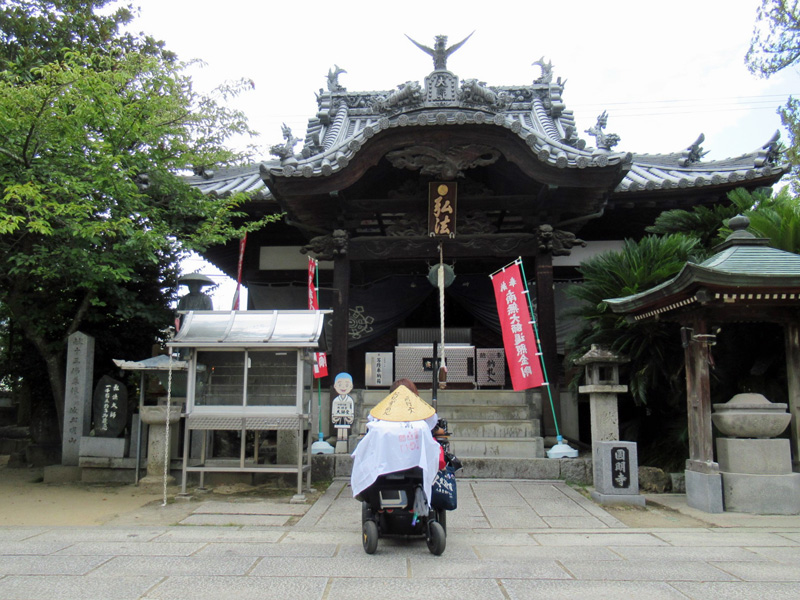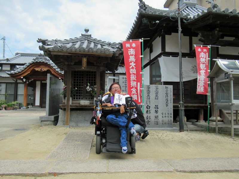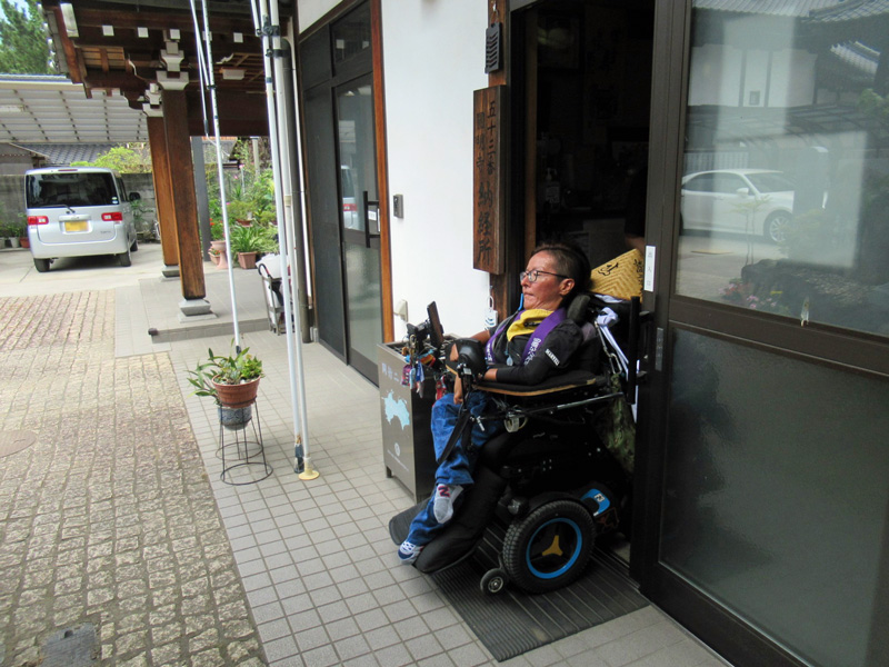 本堂に続いて大師堂での読経を終え、御朱印をもらいに納経所へと向かいます。納経所までも平坦で車いすで行くことが可能です。けれども入り口は僕の車いすではギリギリでした。それでも中に入ることができ、直接お願いすることができました。