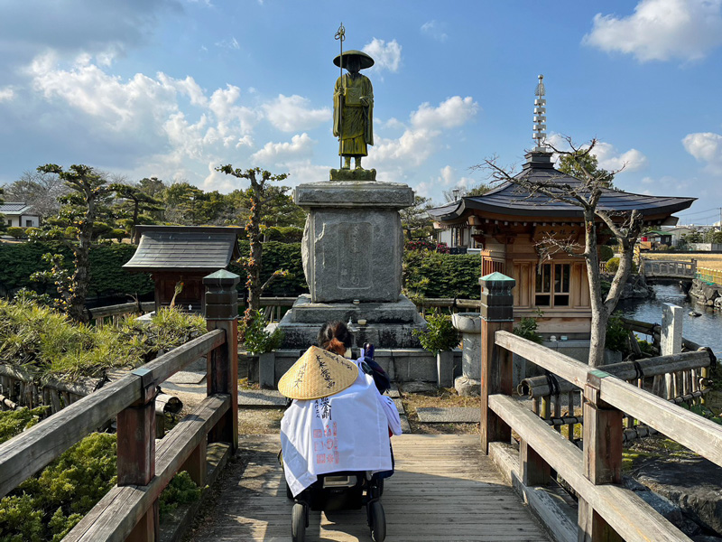 そうそう公園のバリアフリー情報ですが、入り口(正門)入ってすぐのところに溝があります。すっぽり車いすの前輪が入ってしまいます。そのため車椅子の人は駐車場側から出入りすることをお勧めします。公園は杖の淵付近まで石畳が敷かれていますし、地面はところどころ凸凹したところや傾斜もありますが、フラットなところが多く、お大師様が祀られているところまで車いすで行くことができます。公園の中には車椅子用トイレもあります。