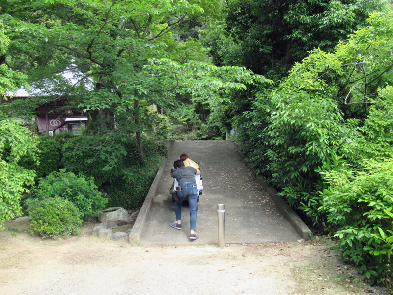 ②左側の舗装道を通れば本堂のある境内手前の階段までスムーズに進むことがありますが、④のスロープに行くためには砂利を横切るようになります。そのためもし車いすのまま参拝するのであれば右側の砂利ではない土のところ(③)を通ることをお勧めします。④スロープの傾斜わりとあります。