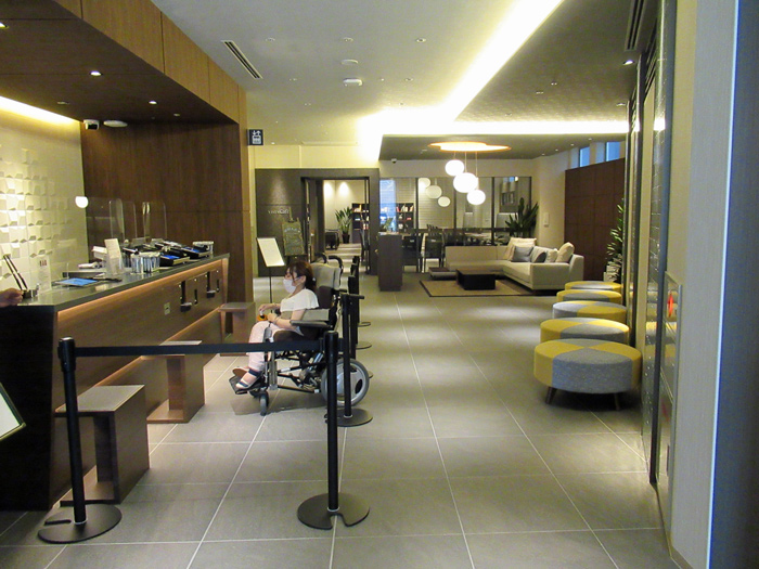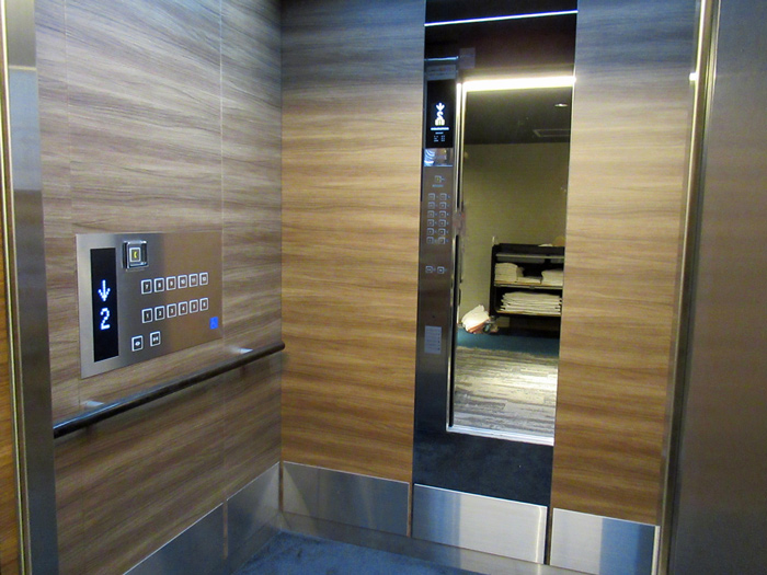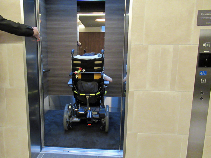 右側のエレベーターも普通の車椅子は回転可能(扉幅80㎝ 幅140㎝×奥行137㎝)。ただし鏡、側面に操作盤はありません。