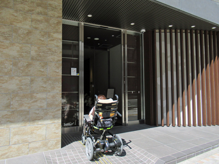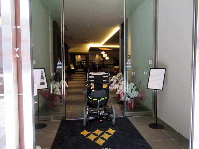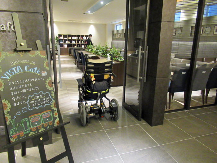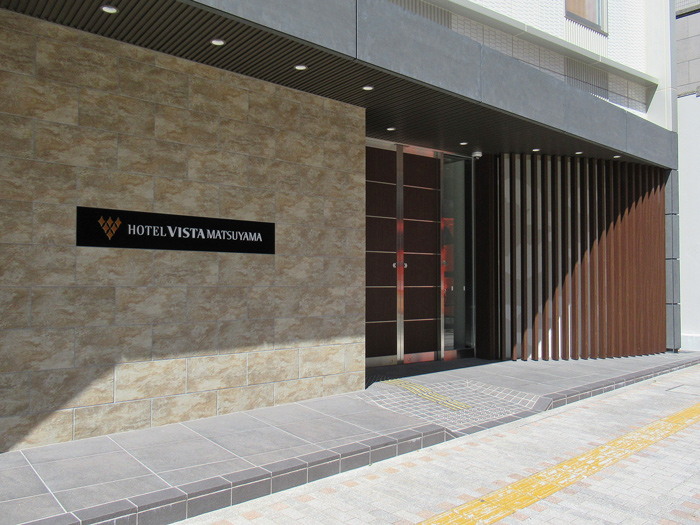 一番町通りにあるホテルビスタ松山 自動ドア前がスロープ状になっています(写真②③)。