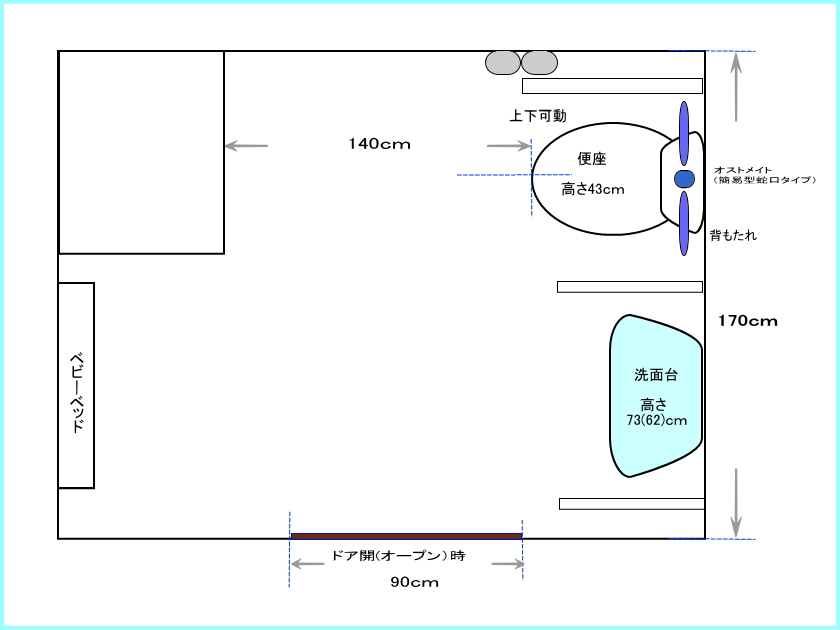 ドア…開き戸 手すり…右側面のみ(L字型固定) 緊急ボタン…有り 洗面台高さ…75(71)㎝