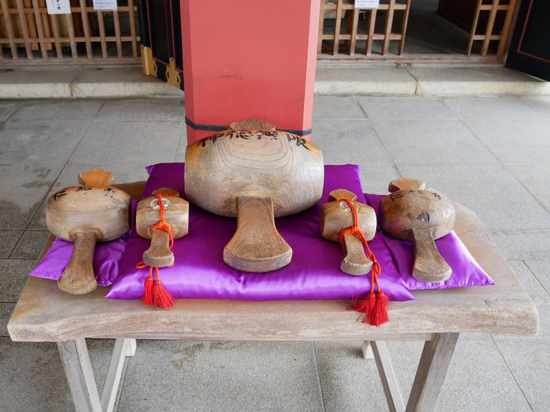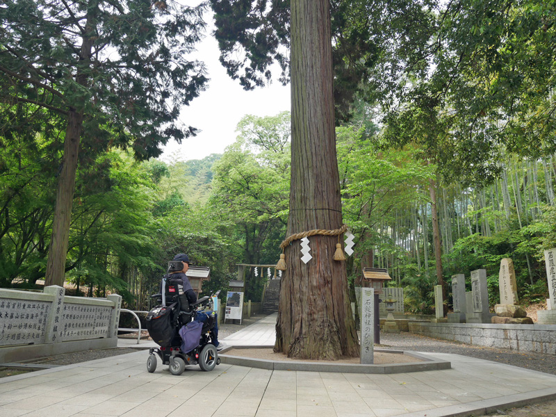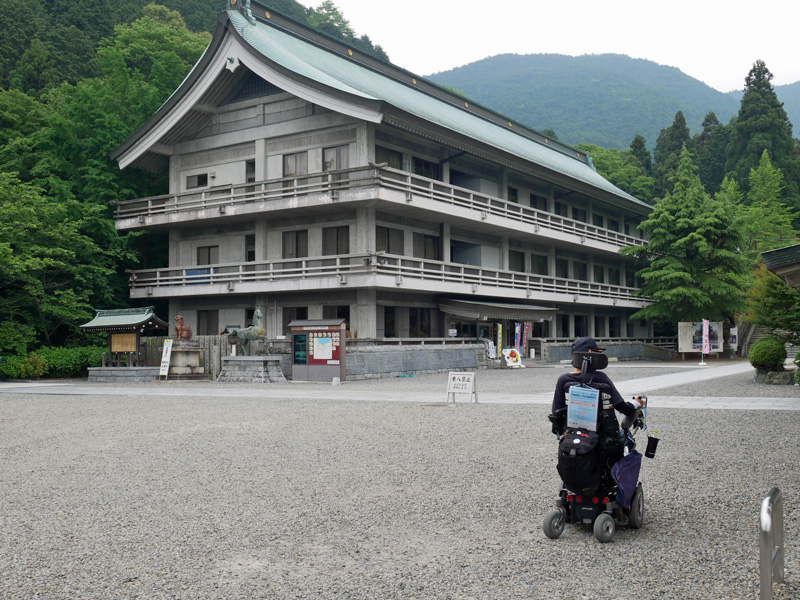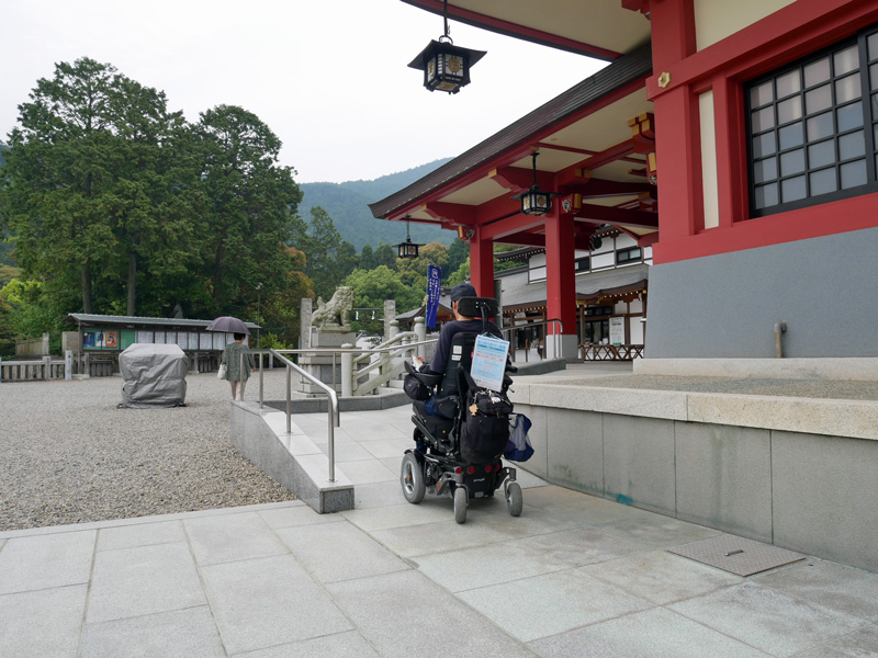 本殿周辺平らですが砂利が敷かれているので移動は大変です。本殿横の石畳が敷かれているところまで車で行き、乗降りするといいです。
