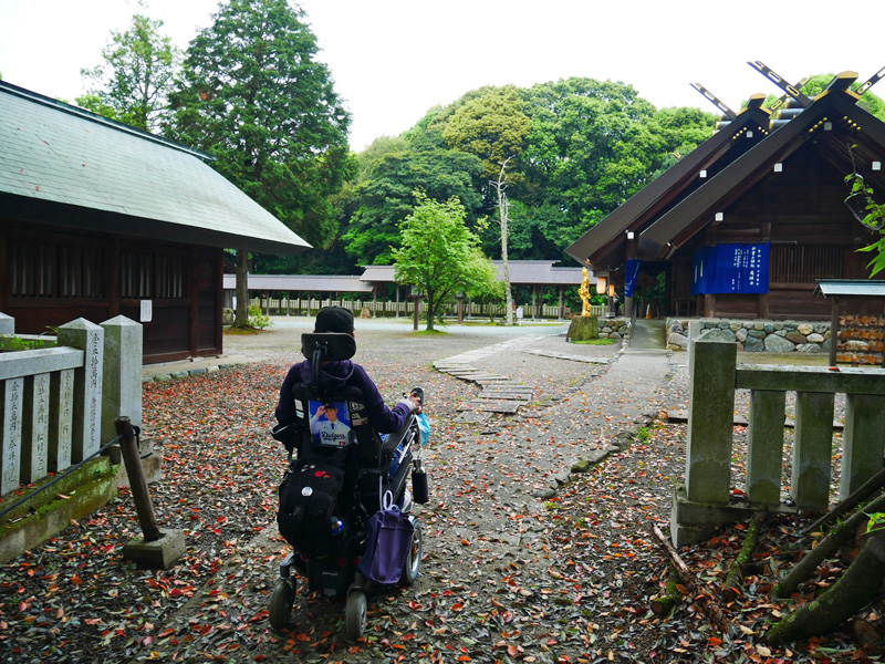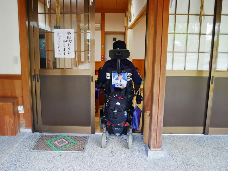車椅子で本殿参拝する場合、参拝者駐車場ではなく「伊曽乃会館」へ行き、伊曽乃会館前に車を止めます。
