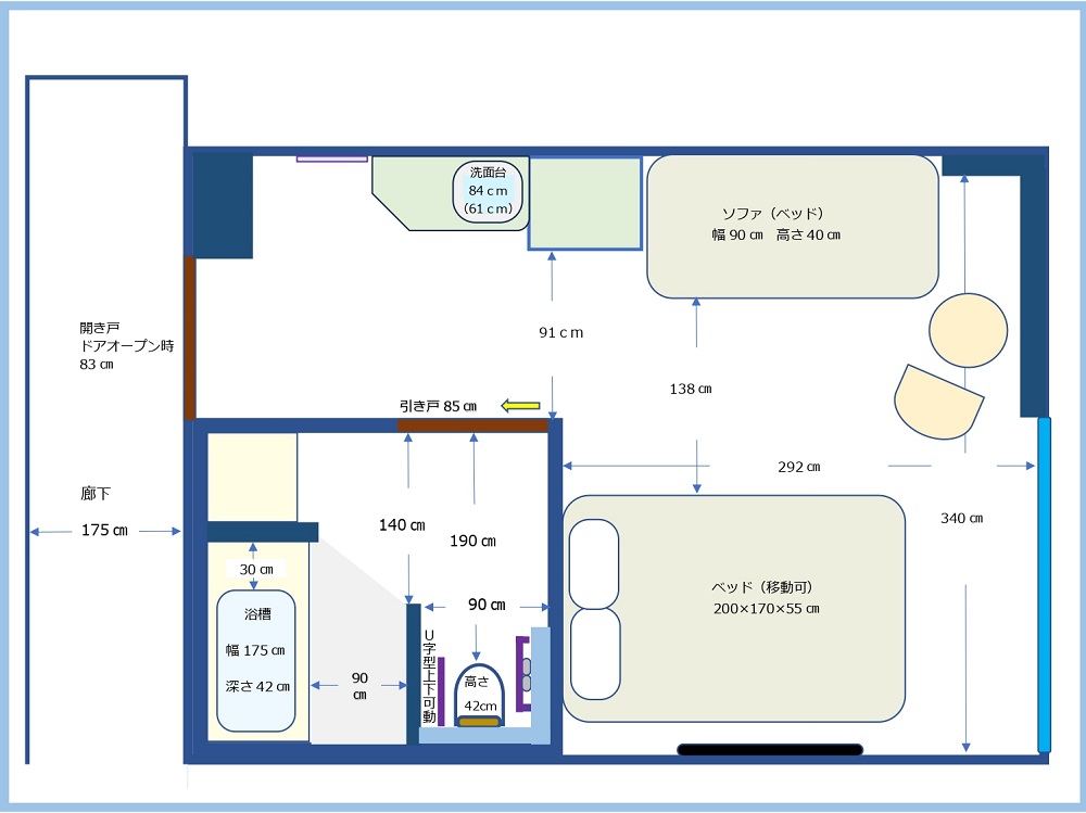 車椅子でも入れますが、いずれもベッドに行くには1段上がるようになります。