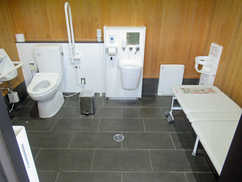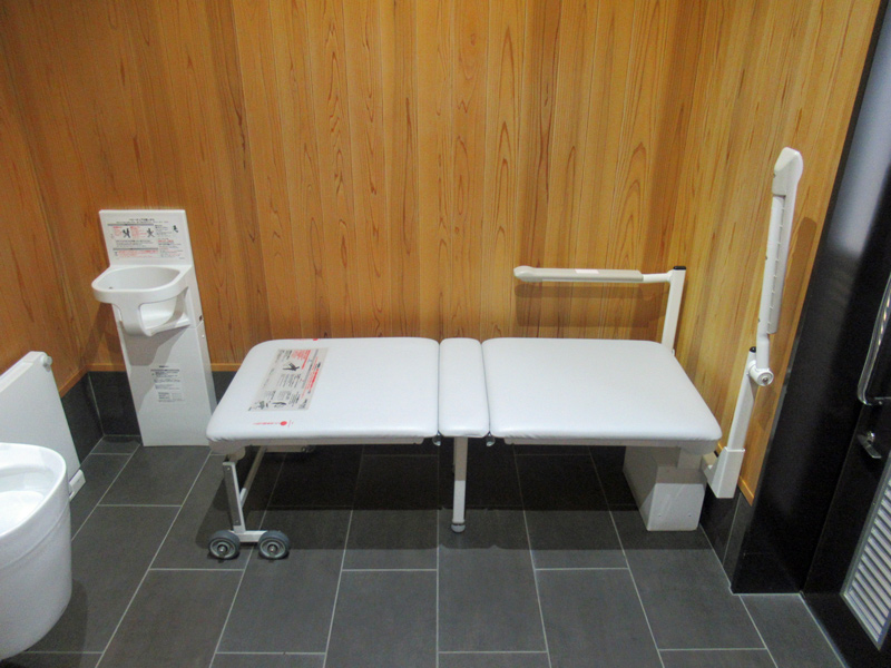 | ウォッシュレット 手すり…便座両サイドにあり 車椅子対応洗面 オストメイト 介助用ベッド 緊急用ボタン チャイルドキープ |