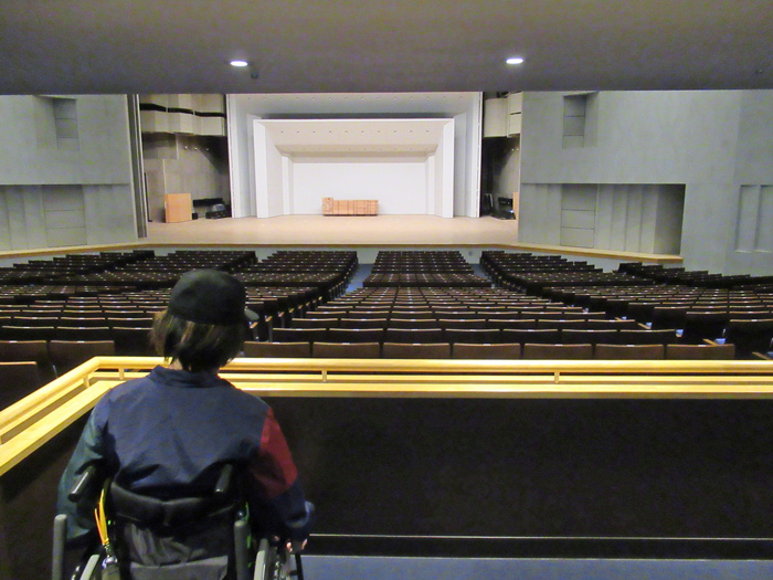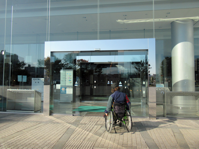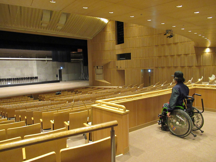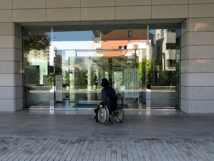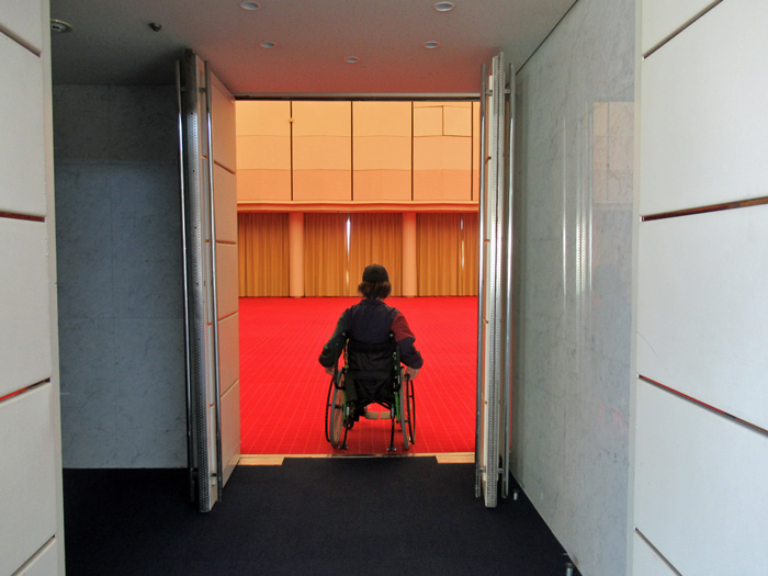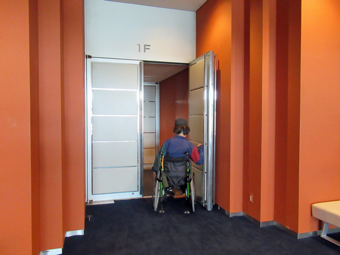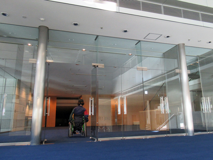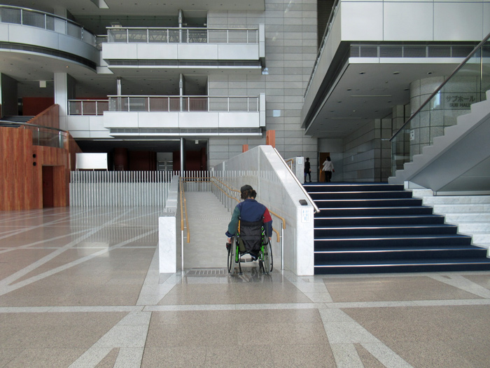 車いすの方がメインホール、サブホールに行く際にはスロープを利用するようになります。スロープが急に感じられる方はインターホンを押すと手伝ってくれます。