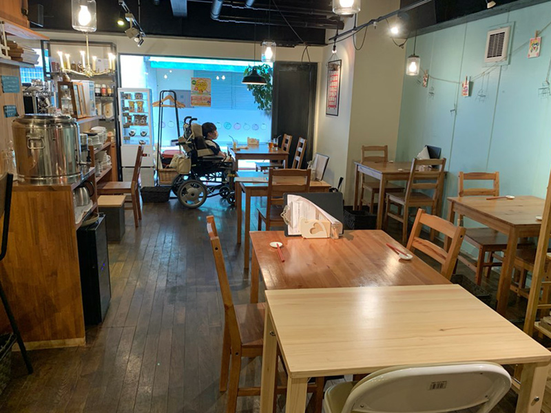 カウンターは、高いので車椅子のままでは難しいかもしれません。他の席はテーブルと椅子どちらも移動可能なので、車椅子のまま席へ着くことが可能です。