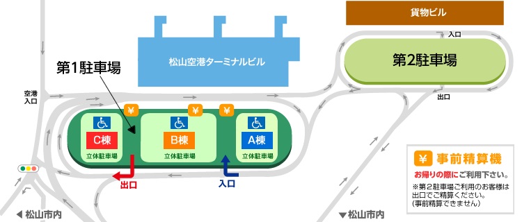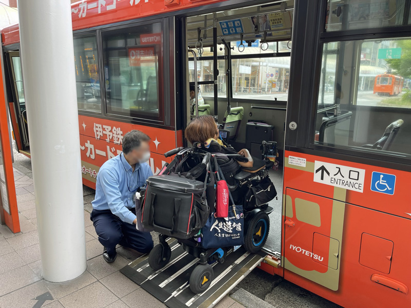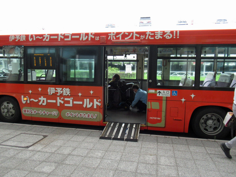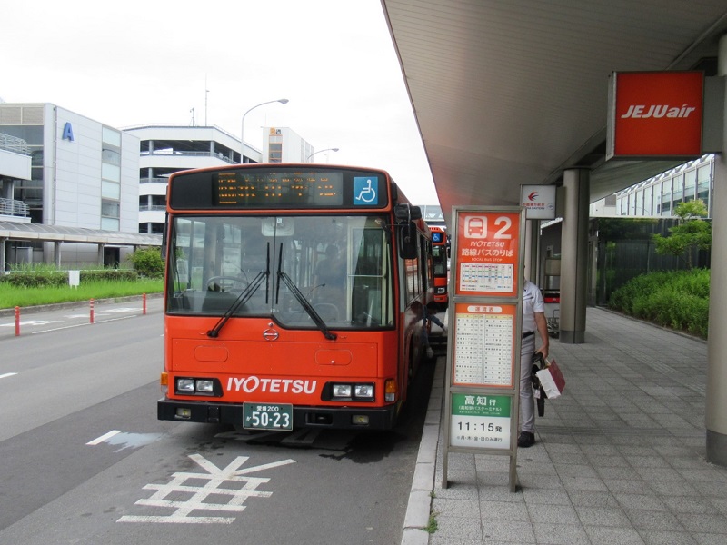 伊予鉄バスがリムジンバスを運行していますが、階段仕様のため車椅子の方は利用できません。(歩行可能ならば利用可能。)車いすのまま利用される方は市内バス(路線バス)を利用するようになります。