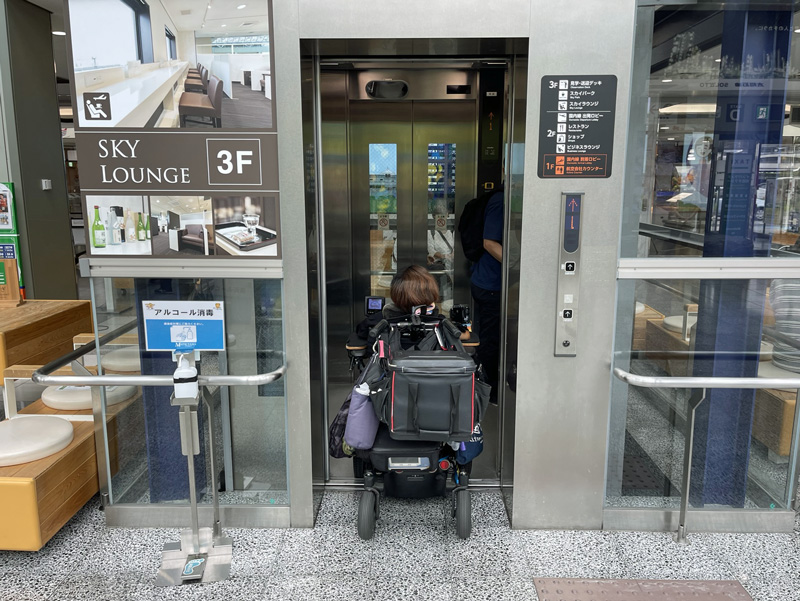 これで飛行機の中に行けます。ANA(全日空)にも車椅子あります。
