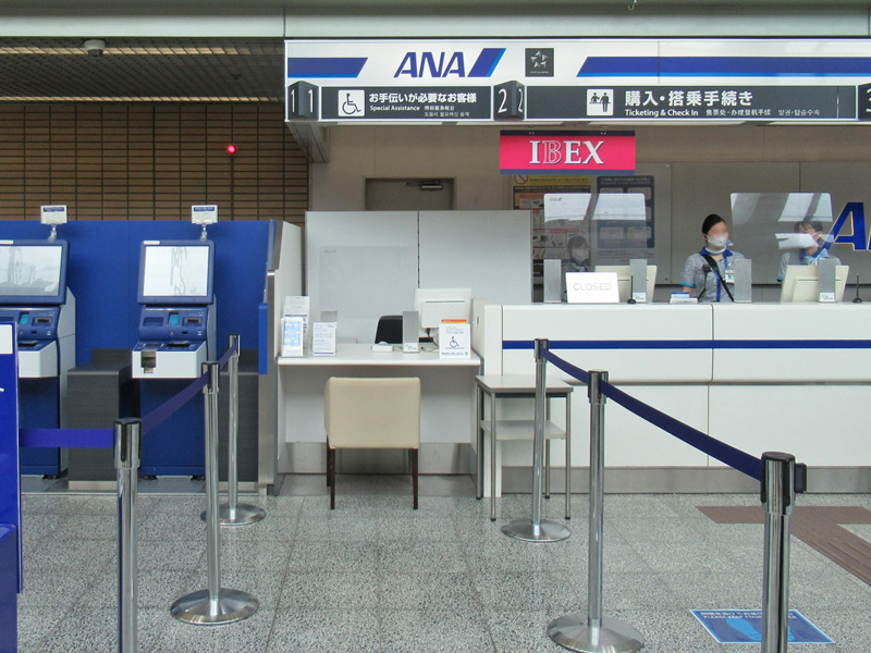 中央付近入り口(国内線到着ロビー前)から入ると、右側がANA(全日空)、左側がJAL(日本航空)とjetstar(ジェットスター)となります。ANAカウンターには「お手伝いが必要なお客様」専用カウンターが設けられています。