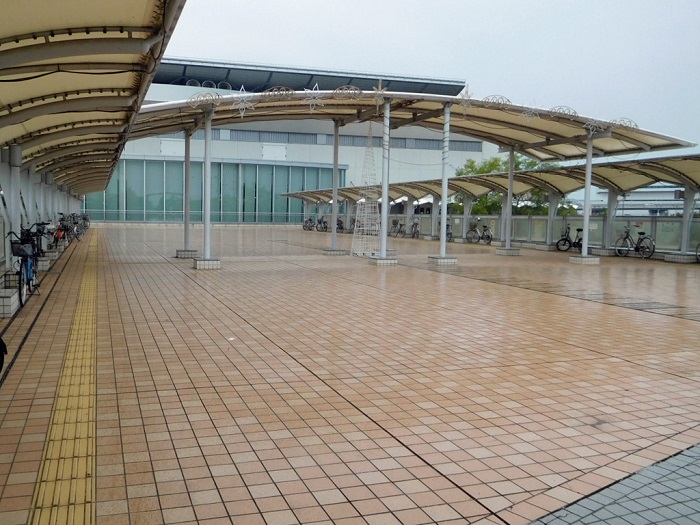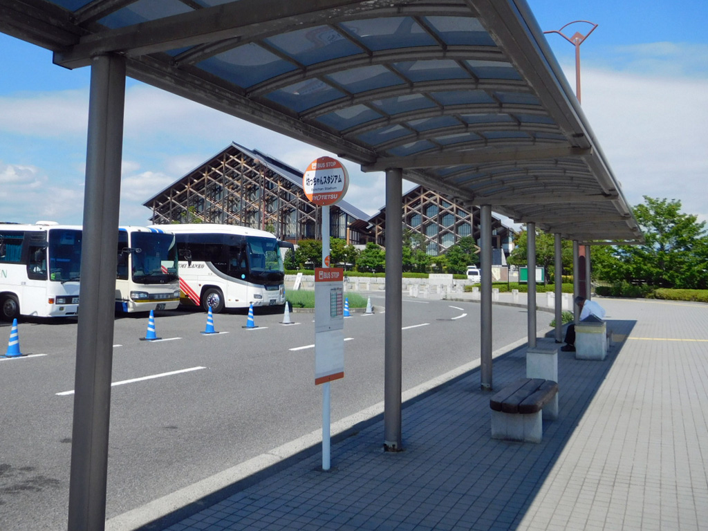 バスできた方は「坊っちゃんスタジアム」で降り、屋根伝いに進めばエントランスにつきます。