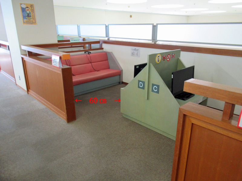 館内フラットです。ところどころ通りにくく感じるところもありますが、車いすが通れる幅が確保されています。(通路幅:平均130㎝ぐらいです。)