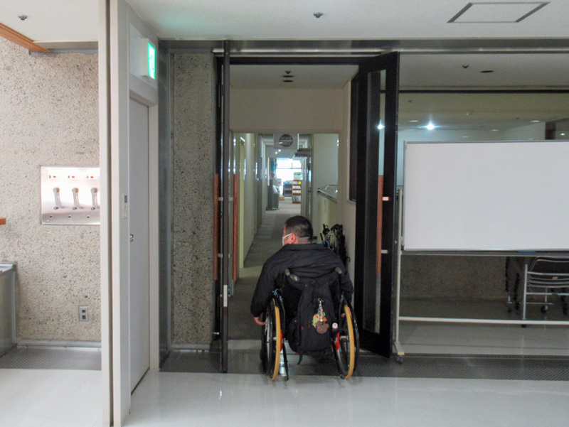車いすの方は2Fから入ることも可能です。ただし扉が閉まっていることもあるので連絡が必要です。(写真の左側扉幅…72㎝)