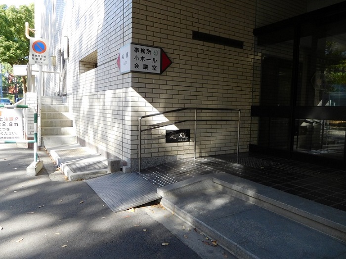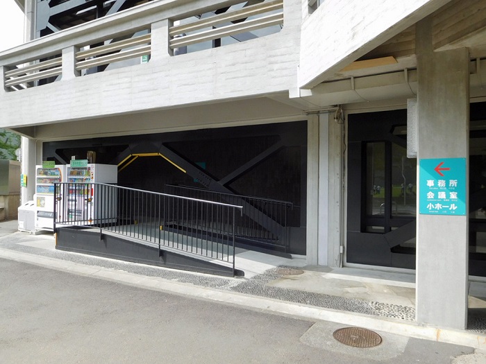 中ホールに行かれる方は北側1階(市民会館の駐車場のあるところ付近)に入り口があります。中に入ってホールに入る途中にスロープがあります。