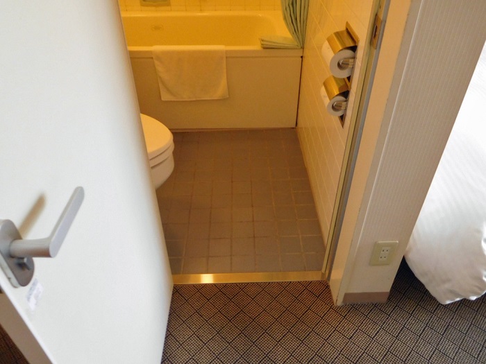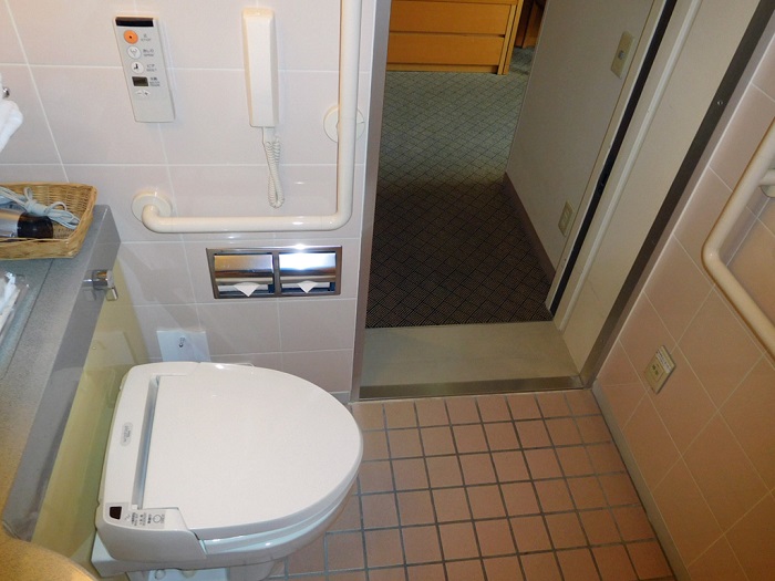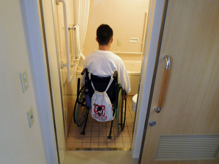 バスルーム扉幅60cmなので、車いすごと入ることはできません。また2cm程度の段差があります。