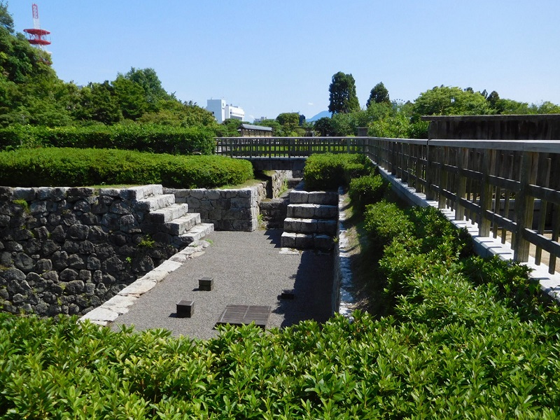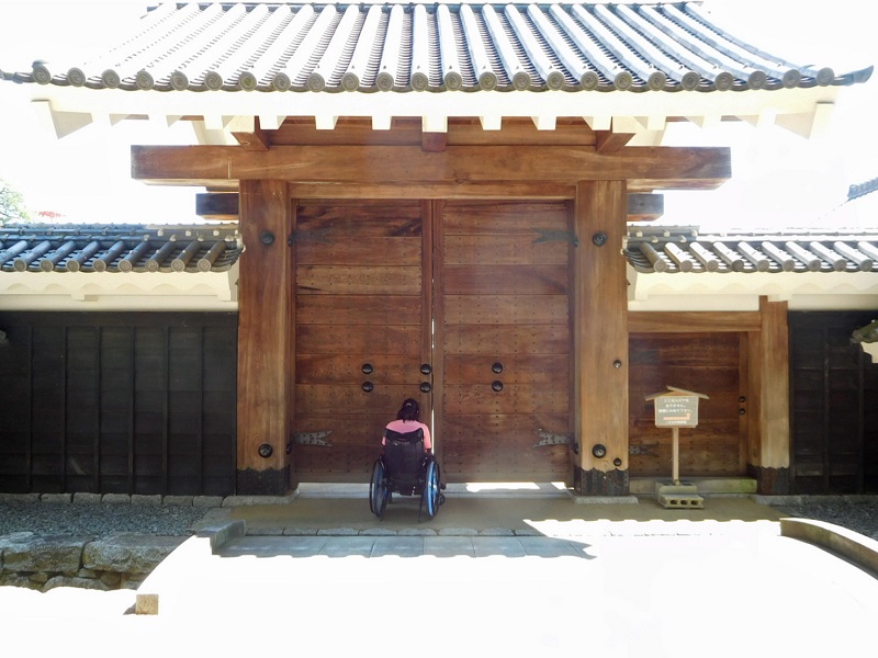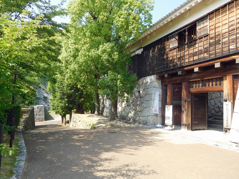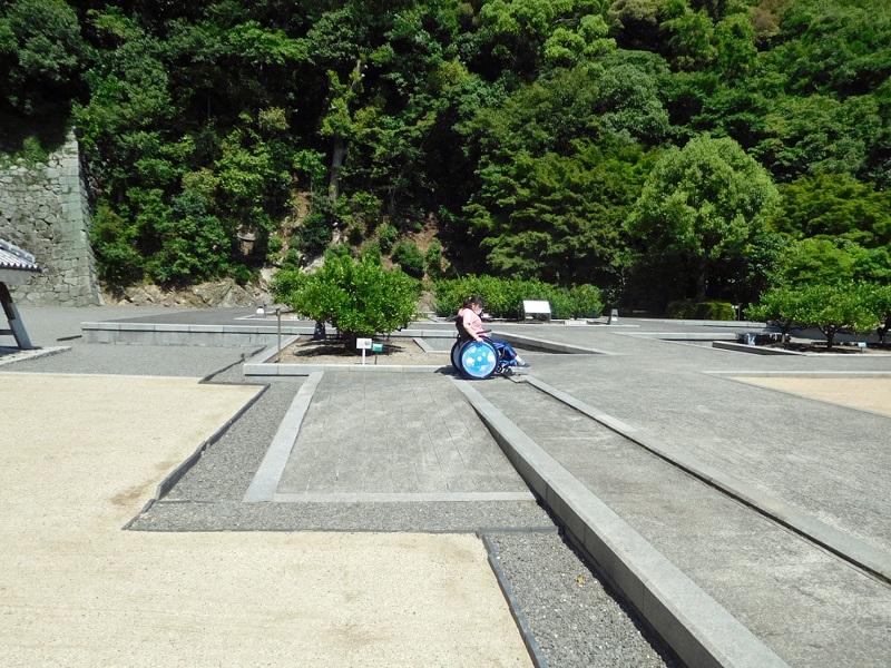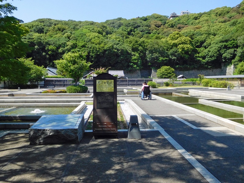 城壁西側に駐車場がありますが、二之丸史跡庭園入口(北門)まで急な坂道となっておりますので、車いすの方、身体の不自由な方は、登り口にインターホンがありますので北門まで車で上がらせてもらえるよう管理事務所に連絡してください。 (電話の場合は、TEL:089-921-2000 二之丸・堀之内管理事務所)