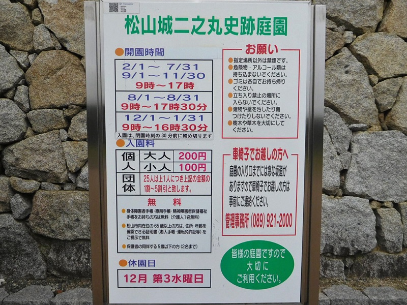(二之丸・堀之内管理事務所 TEL:089-921-2000)
