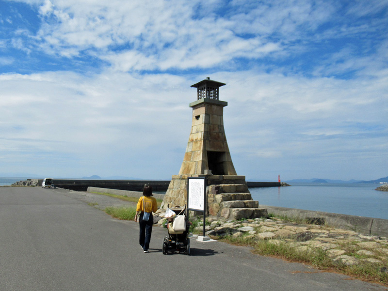 町家でお昼を過ごした後、港方面に向かいました。信号を渡り商店街の一角を通り、しばらく歩くと見えてきたのはのどかな漁港風景。漁港近くにある五色浜神社に立ち寄り、そのまま五色姫通りを進んでいくと石の燈籠のようなものが…。案内板を見てみると「萬安港旧灯台」といい、明治時代の終わりまで防波堤の先端にあったそうです。