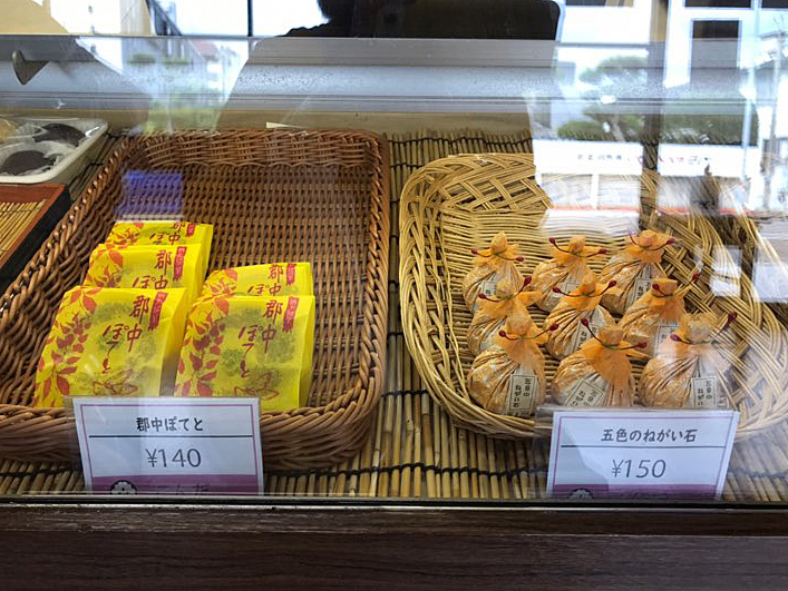 店主にお話を伺うと、郡中ぽてとのほかにも五色姫伝説をモチーフとして作った『五色の願い石』もあるとのこと。またお店で一番人気は『ふまんじゅう』であることなど教えてくれました。
