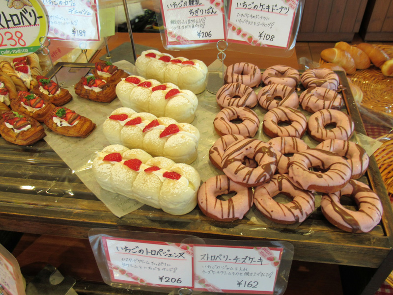 塩パン以外にもパンの種類がとても豊富です。総菜パンや石窯で焼かれたピザ、またこの季節はイチゴを使った美味しそうなパン。どれも食べてみたくなります。