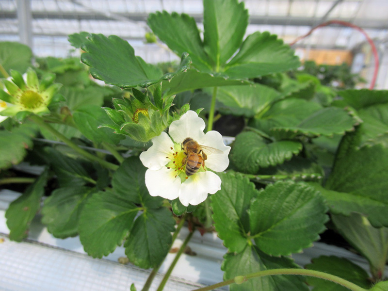 あといちご狩りをしているとミツバチがよく飛んでいますが、そ~っとしておいてあげましょう。このミツバチさんたちが美味しいイチゴができるようにせっせと働いてくれているのです!!