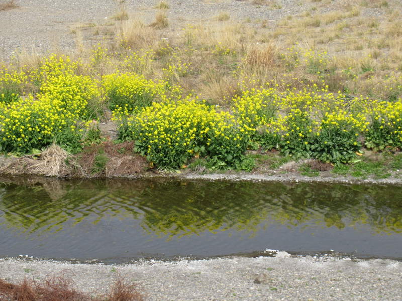 土手下にははだか麦畑があちこちにあり、川沿いには菜の花がたくさん咲いています。川面に黄色い菜の花がぼんやりと映りとても神秘的でした。