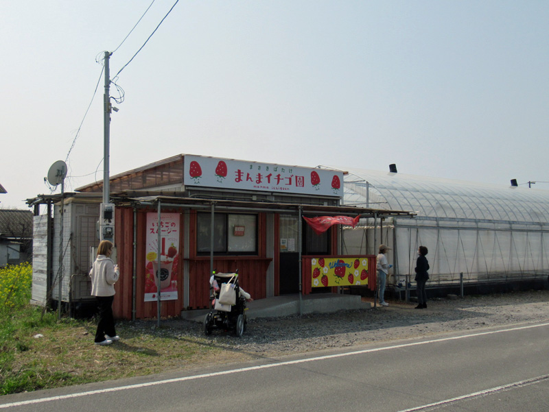 ひょこたん池から次に向かったのはすぐ近くにあるビニールハウスです。ハウス前には大きないちごスムージーの写真の看板が! ここはイチゴ狩りができる「まさきばたけ まんまイチゴ園」です。