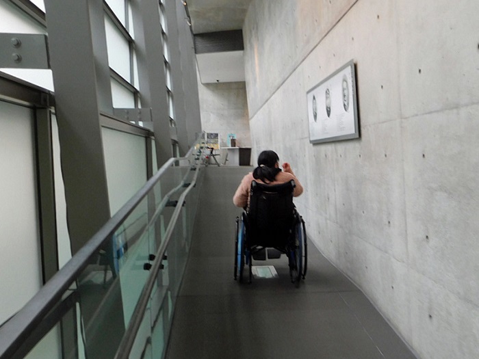 エレベーターで各階に上がることも可能ですが、通常の見学ルートを通るとスロープを利用するようになります。