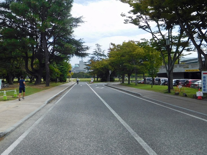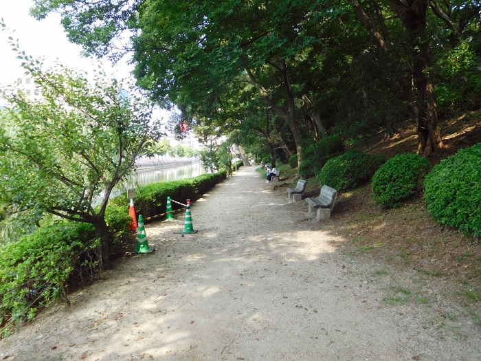 お堀外側は舗装された歩道ですが、内側は未舗装です。歩き固められていますがところどころ凸凹あります。