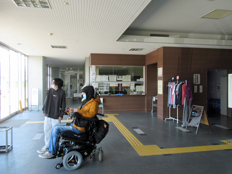 入り口入って左手に受付(ロビー②)があります。正面に競技場入口、左手にトイレ(バリアフリートイレ)、会議室(控室)があります。